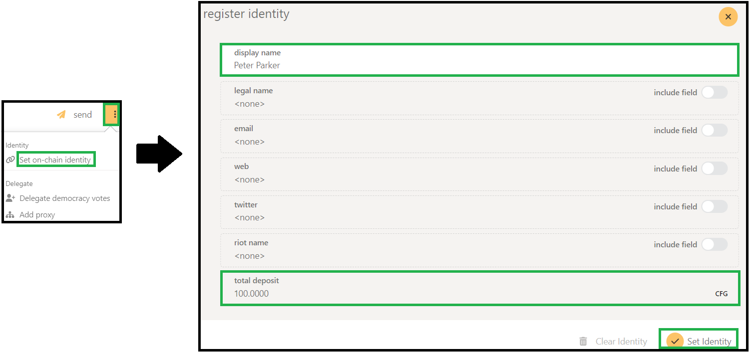 The name you choose will be displayed instead of your wallet address.You can also add additional information, like email, website, Twitter handle, etc. The only obligatory field to fill out is display name - all the others are optional. Once you have added the information you want, you simply click Set identity. When you create an on-chain identity, an amount of 100 CFG is reserved (locked). This amount will be unlocked again once you remove your on-chain identity.