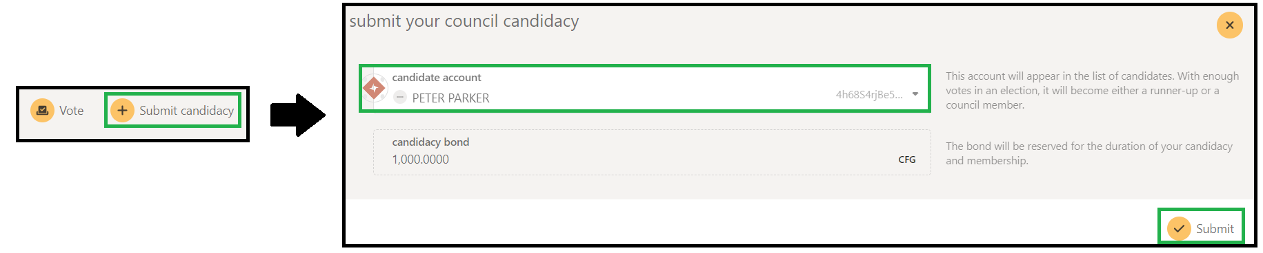 Select the account you just created an identity for and click Submit. There is a self-bond of 1000 CFG which is reserved (locked) for the duration of your candidacy. Just like the identity, you will get this back when you remove your candidacy.