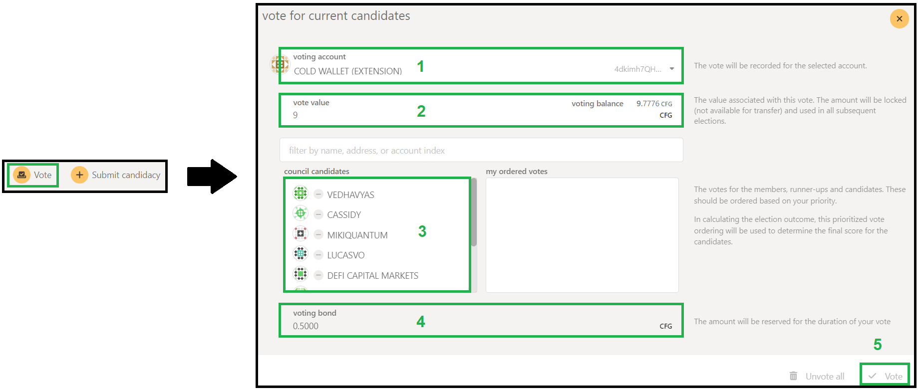 4. When you vote for council candidates, a very small amount of CFG is reserved for the duration of your vote (the amount indicated under voting bond). The reserved amount is calculated by saying: base fee 0.5 CFG + 0.5 CFG per candidate you vote for.